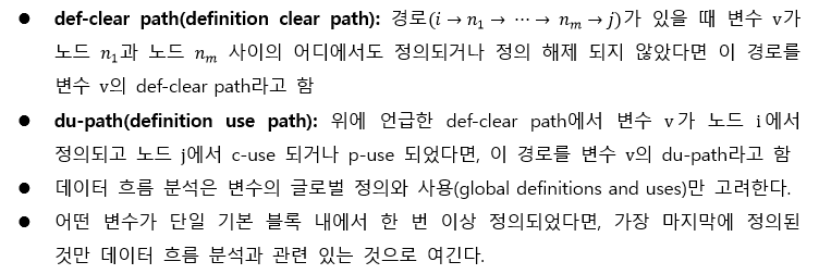 - 데이터 흐름(Data Flow): 어떤 한 변수의 ‘정의(definition)’에서부터 ‘사용(uses)’까지의 그 값의 흐름