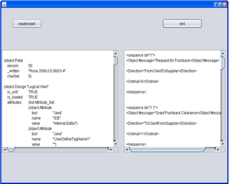 Petal 파일을 파싱하여 모델 파일을 XML 파일로 전환한다. XML 파일 생성을 위해 스트링(string)과 좌우 괄호를 검색한다. 그림 9는 시퀀스 다이어그램의 .mdl 파일을 가져와서 XML을 생성하는 Java 프로그램의 스크린샷이다. Java 프로그래밍에 Netbeans IDE가 사용되었다.