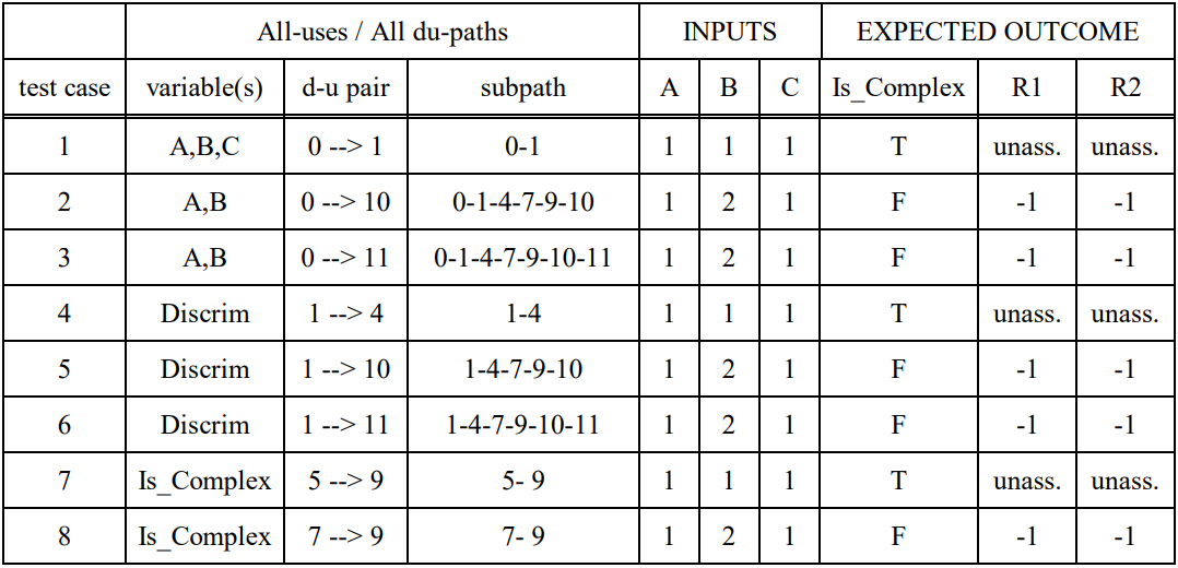 100% All-uses 데이터 흐름 커버리지를 달성하려면 각 변수 정의에서 해당 정의의 모든 사용(p-use와 c-use 둘 다)에 대한 하나 이상의 하위경로를 실행해야 한다. 다음 테스트 세트는 이 요구사항을 충족한다.