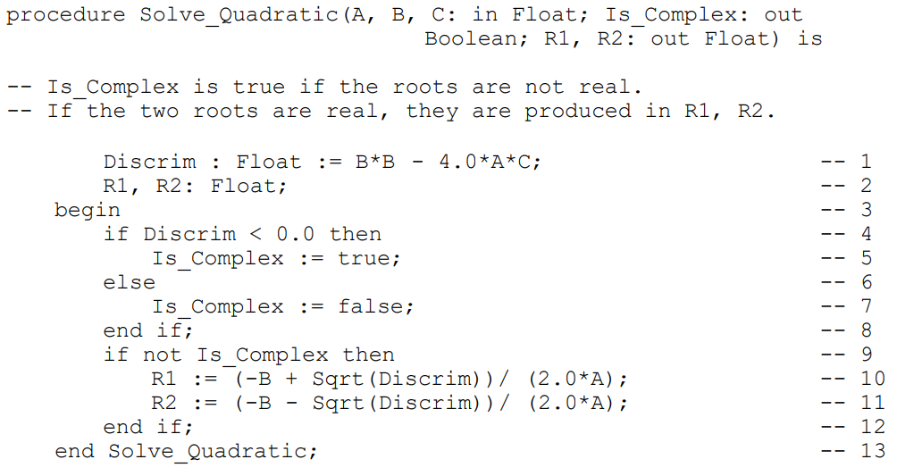 Ada 언어로 작성된 아래 소스 코드에 데이터 흐름 테스트를 적용한다고 가정하자. 아래 코드는 이차방정식 판별식 체크를 하고 근의 공식을 사용해 실근을 구하는 프로그램이다.