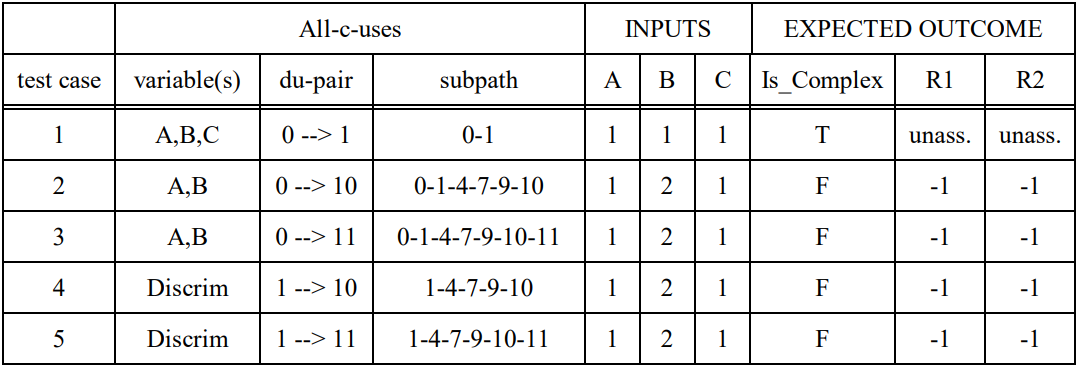 100% All-c-uses 데이터 흐름 커버리지를 달성하려면 각 변수 정의에서 해당 정의의 모든 c-use까지의 하위경로가 하나 이상 실행되어야 한다. 다음 테스트 세트는 이 요구사항을 충족한다.