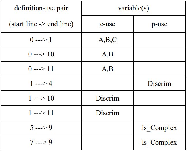 단계3: 정의 열의 각 항목에서 c-use 또는 p-use 열의 해당 변수에 대한 각 항목으로의 링크를 식별하여 du-pairs와 그 타입(c-use 또는 p-use)을 식별한다.