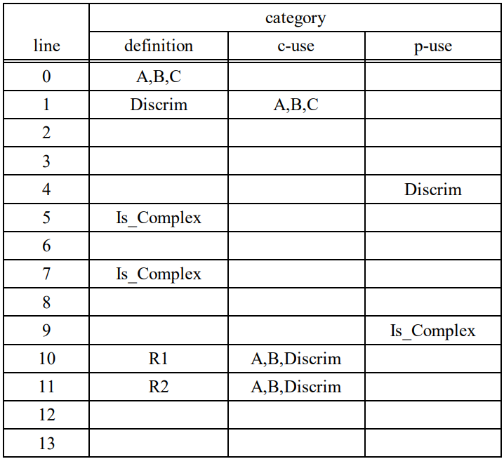 단계2: 프로그램에 변수가 등장할 때마다 나열하고 상응하는 카테고리(definition, predicate-use 또는 computation-use)를 할당한다.